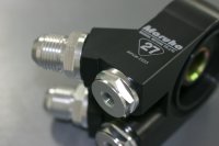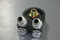 An all-in-one sandwich plate solution might be available from Maruha Motors. They have a new oil cooler kit. Their custom sandwich plate has 2 -10AN ports for oil feed/return lines, and two extra plugs which are intended for sensor use (1/8 NPT). From the pictures, it seems that all 4 ports are large, and that there are 2 -10AN adapters and 2 1/8 NPT adapters. If that is the case, I would think that the 1/8 NPT port(s) could be converted to -10AN. Just a thought.
