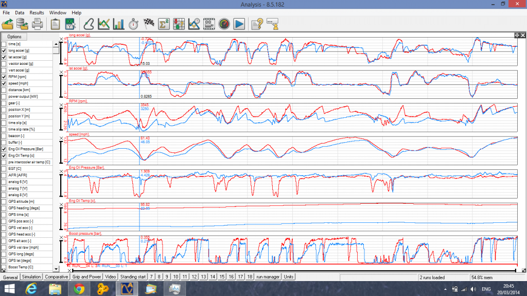 Here is a screen shot from a data log comparing 2 laps. the red is a reasonably hot lap and the blue is out of pit lane taking an easy lap to warm the car. seems a lot worse when the revs have been higher for longer and obviously when the g load is higher.