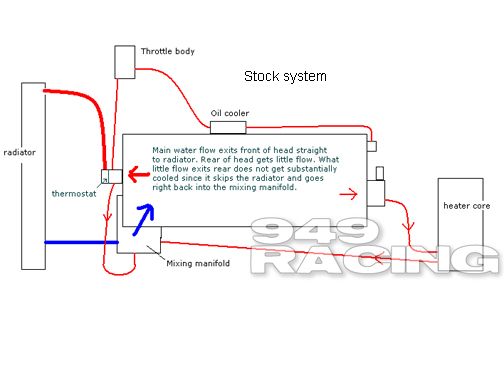 The hot water exit the front of the head to the radiator in stock configuration. It exits the rear of the engine to the radiator when rerouted.
