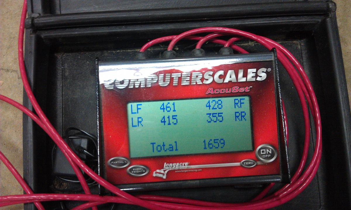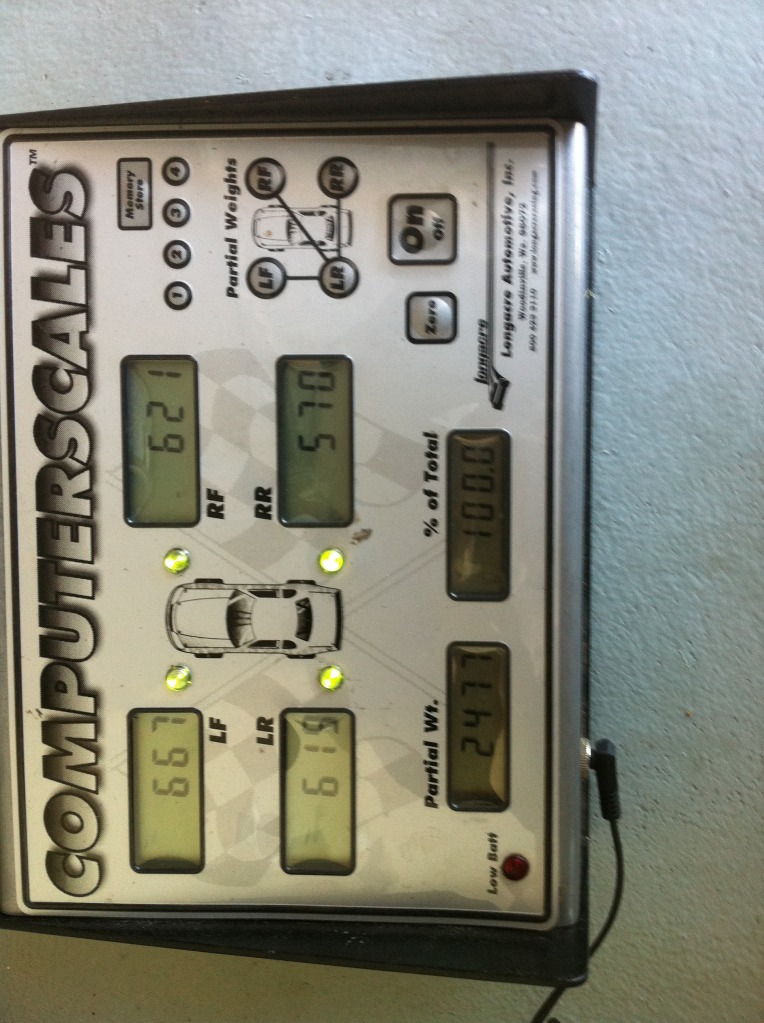 I wish I had a pic of the corner weight on my car, it's 1924 lbs wet, including 40 lbs ballast, over 50% rear wt biased. Unfortunately It's corner-weighted for all 255 lbs of me :-( (I'll add another 25 lbs ballast when I finally start using Avon slicks).