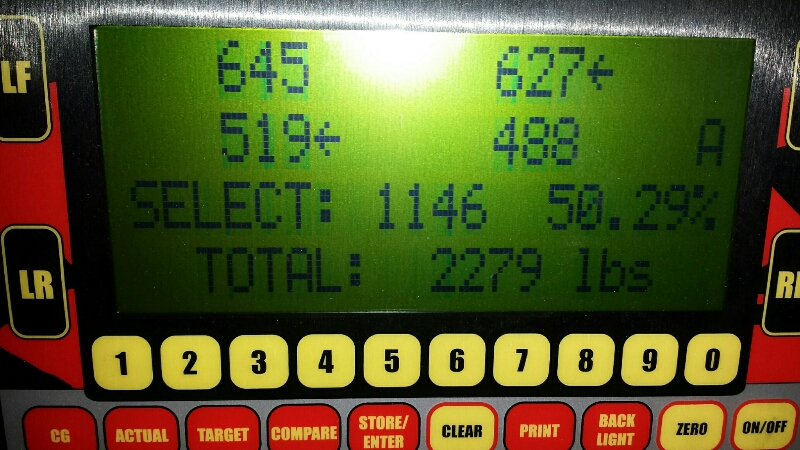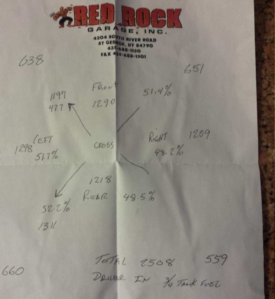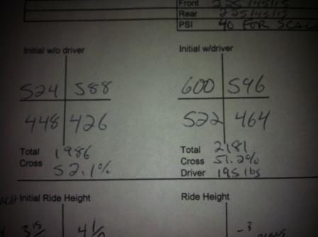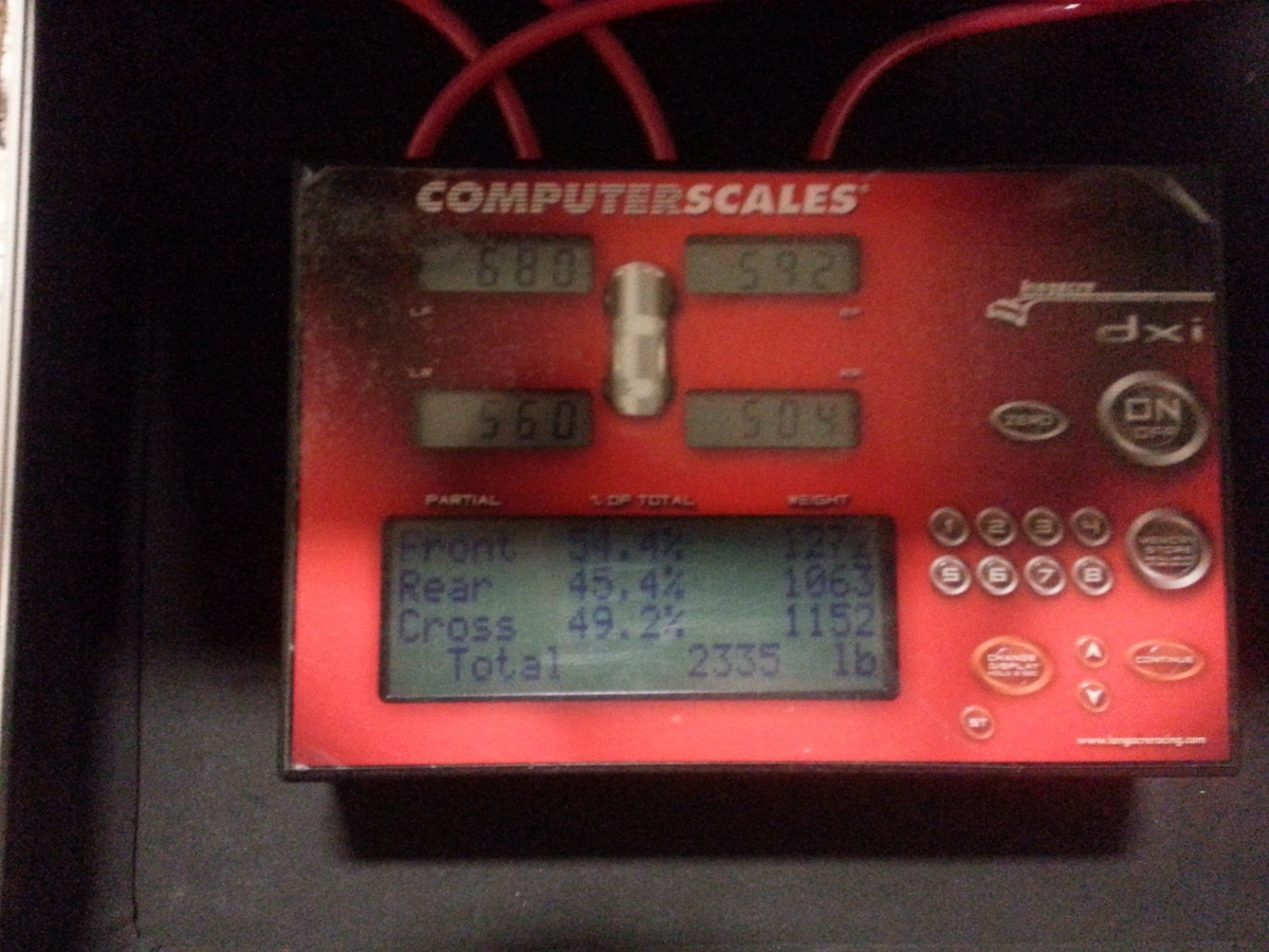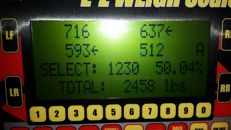 The corner weights are all static. I wonder where the weights fall most of the time during actual driving. Given the amount of time on the go pedal vs the brake I bet the balance is a lot better than what the scales say.