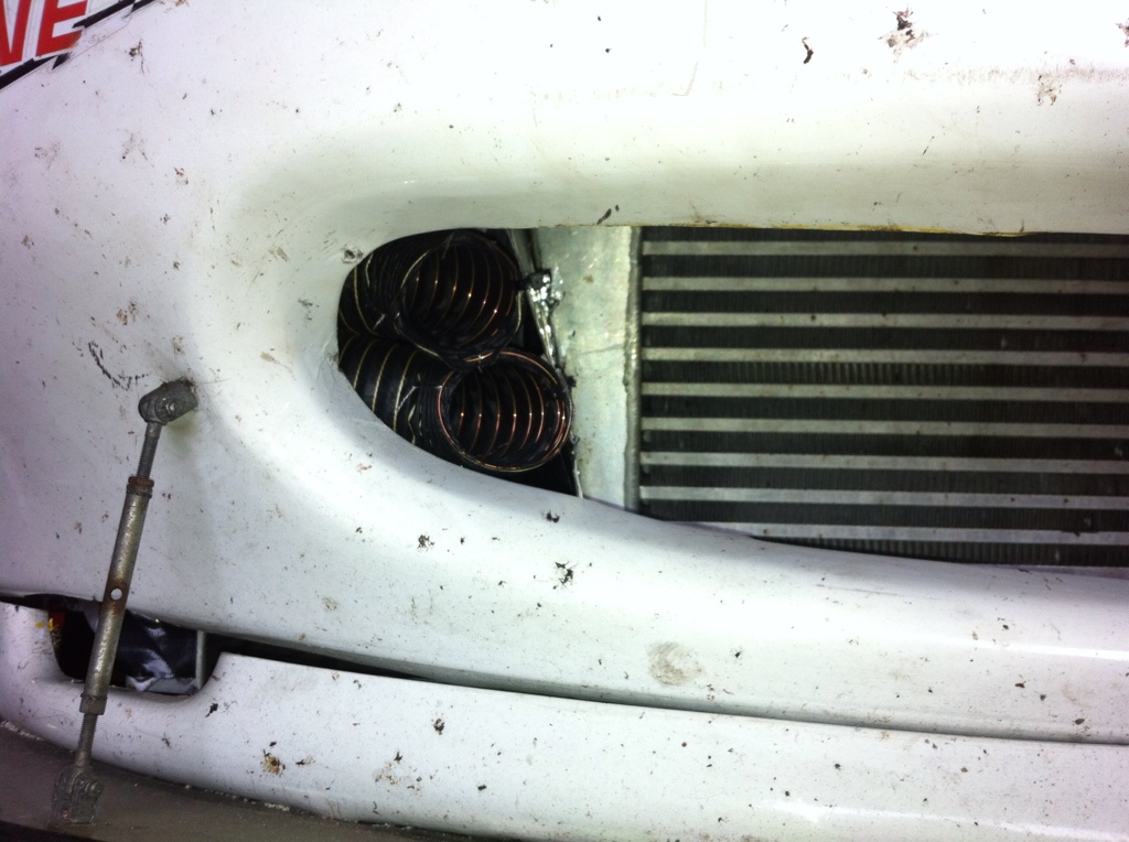 I like the idea. I was considering doing something very similar, except with larger hoses (left over 3" brake hose) and NACA ducts to feed the tubing. Ideally you want the inlet to be about 33% of the surface area of the heat exchanger. Its hard to tell from the pics but I agree that the inlet area is a little small. It could also be improved by smoothing out the transitions into and out of the hoses.