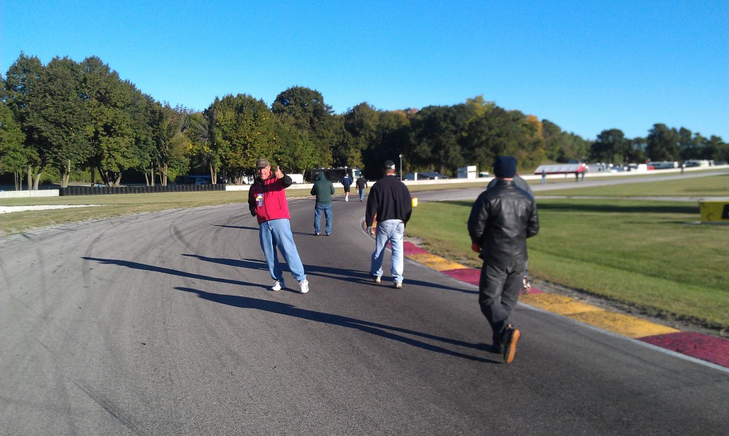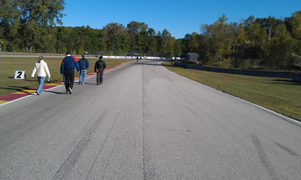 The track walk was amazing, first impression is how narrow the track is. Also, the straights are not straight, front straight you climb a big hill and the track slopes from drivers left to right, the right side seems to have less incline because of this. Middle straight from turn 3-5, you crest a slight rise then start a down hill run, as you approach the braking zone there is a slight bend to the left, then a larger drop to turn 5, I never did get braking right in this zone but it got better as the week wore on. Last straight from the exit of the Kink to Canada Corner, this straight has 2 bends to the left, and left me struggling to find the absolute shortest distance to the braking zone.