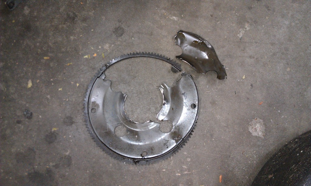 After the race was over and we were released from impound my starter wouldn't engage, I figured it was just a bad bendix. Got a new/used starter and after pulling the old strater found that the teeth had been ground and that the flywheel appeared damaged. Here is what I found.