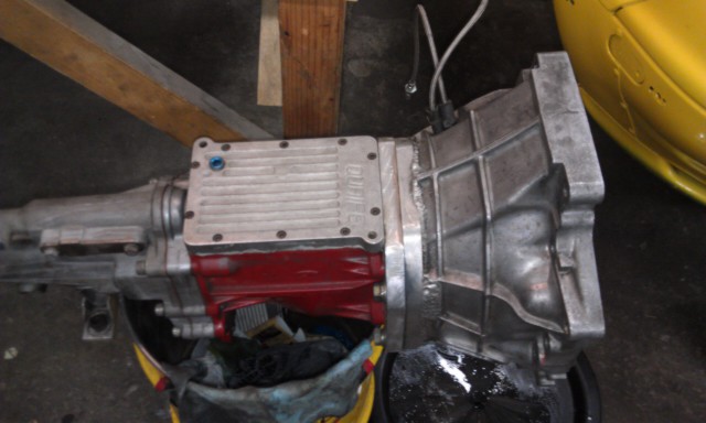 Fae, I am running a Quaife Sierra dog box, if you look you can see two plates that make up the adapter, one plate is mounted to the transmission case, and one is welded to a shortened bell housing, that plate serves as a mounting surface for the throwout bearing and is also bolted to the plate mounted on the transmission case.