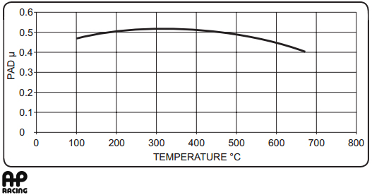 This graph from AP Racing illustrates the relationship between friction (y-axis) and temperature (x-axis) for one of their popular brake pads. You can see the friction drop off significantly even within the approved operating range of the pad: