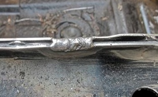 Here is a setup weld, getting the settings close on a HF welder using Lincoln wire. Not that bad for the price really. This is just wire brushed for like 5 seconds after the weld cooled. It's a serviceable unit if your budget is tight. Just use better wire than they provide is my tip. You can see the factory spot welds to the left and right of it.