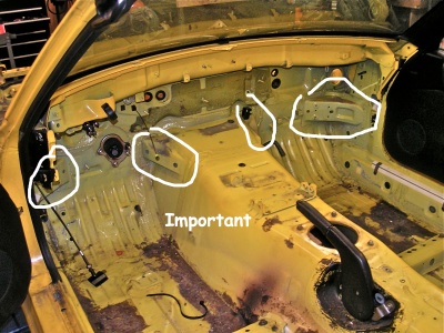 A) Door sill seam like in the photo…suggest doing those in a stitch fashion rather than one continuous weld for various reasons. This is the zone that the pull-off weather stripping and scuff plates cover. I would not be too worried about the front seat mount brace but while you're there it can be done.