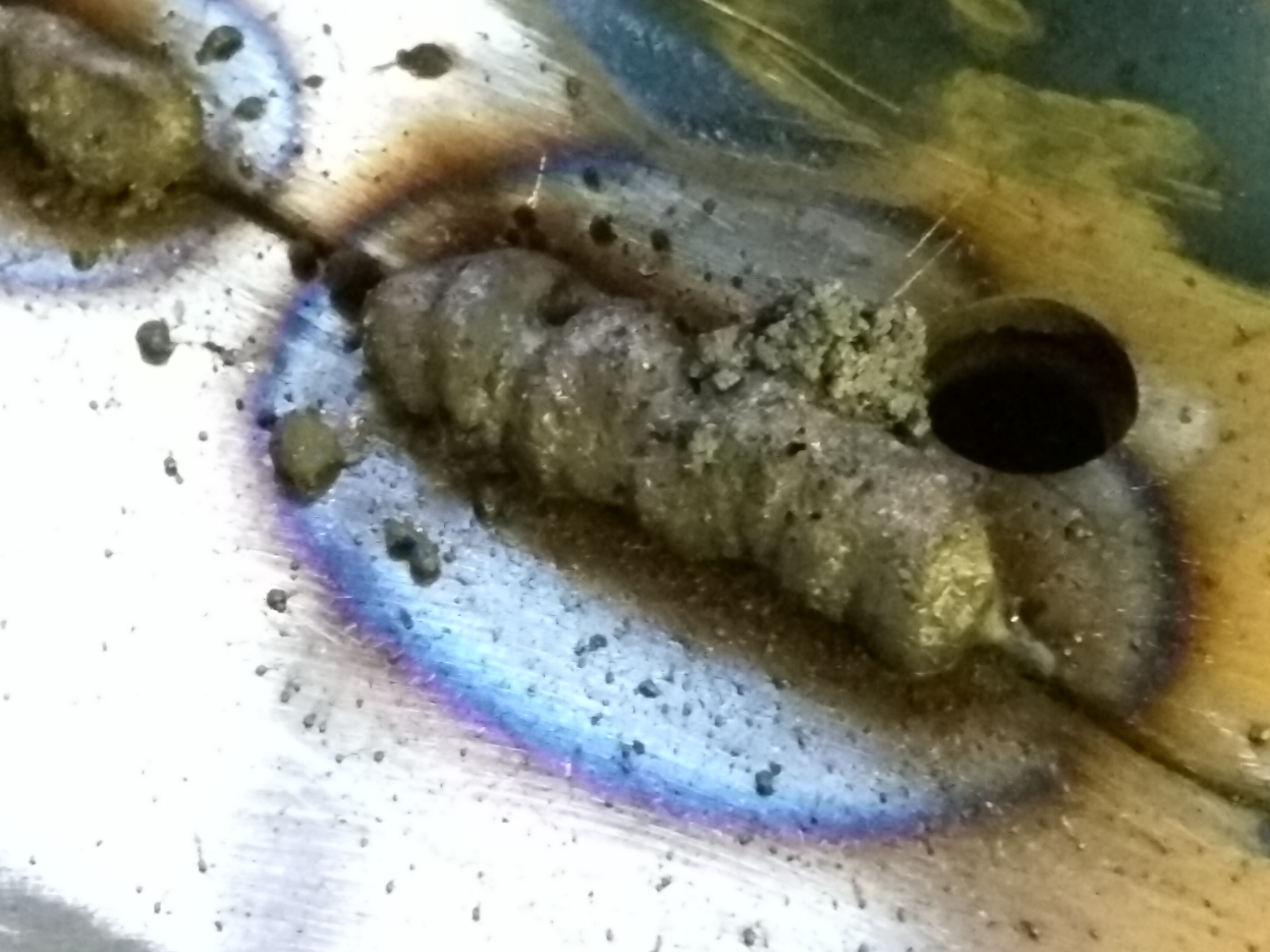 ^^^^ yes, contaminated and cold. Those worms and mountains are from grinder dust and the adhesive. Blow it all out with air, then weld. And turn it up! You can stitch with lots of heat.