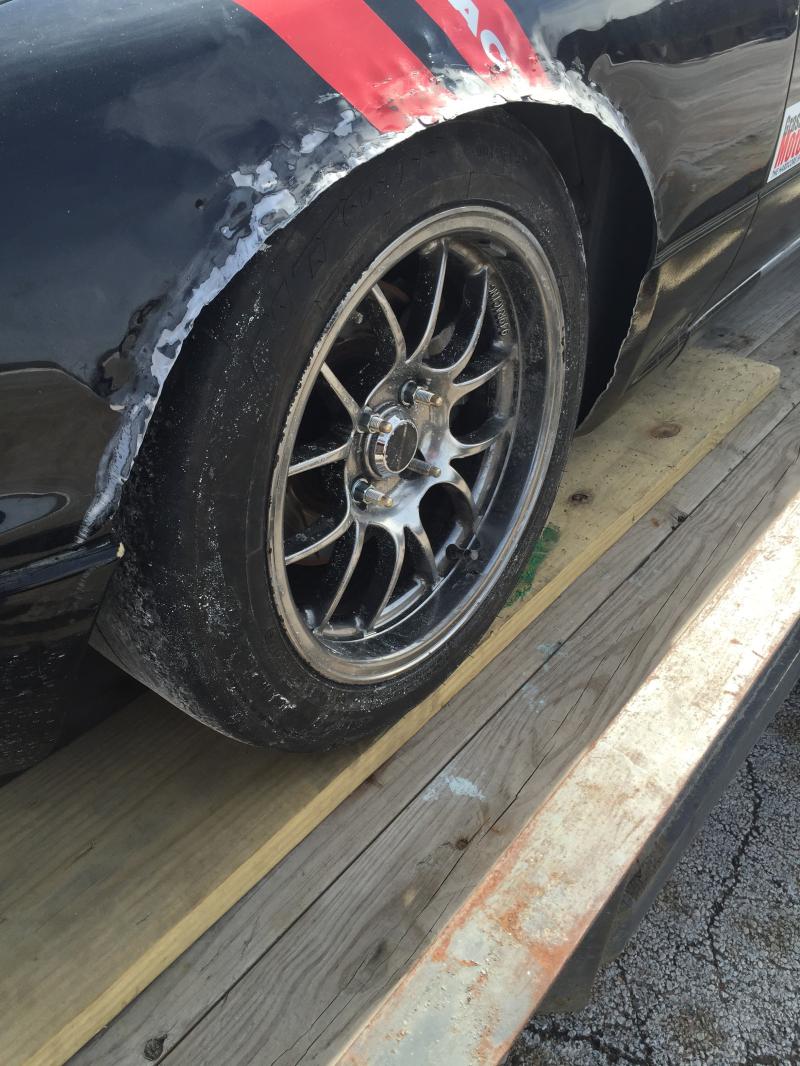 I'm planning to run this weekend's Blytheville Prosolo in SSM with my Miata Snoball. We cut the fenders and flared them, but the 15x10 Jongbloed's with 275/35/15 Hoosiers appear to rub on a ridge on the firewall, rear most area of the wheel well. We have tried both 5mm & 10mm spacers.