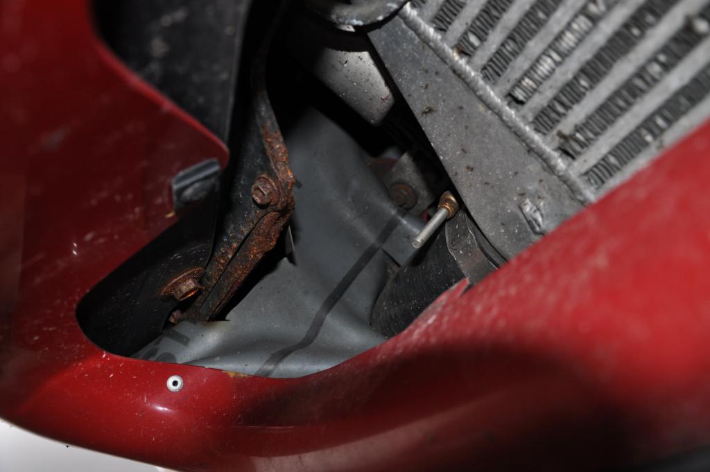 See the radiator hose in the pic below going to the radiator. The pan that connects the radiator to the nose is bolted to the fan brackets on the radiator and extends forward below it.