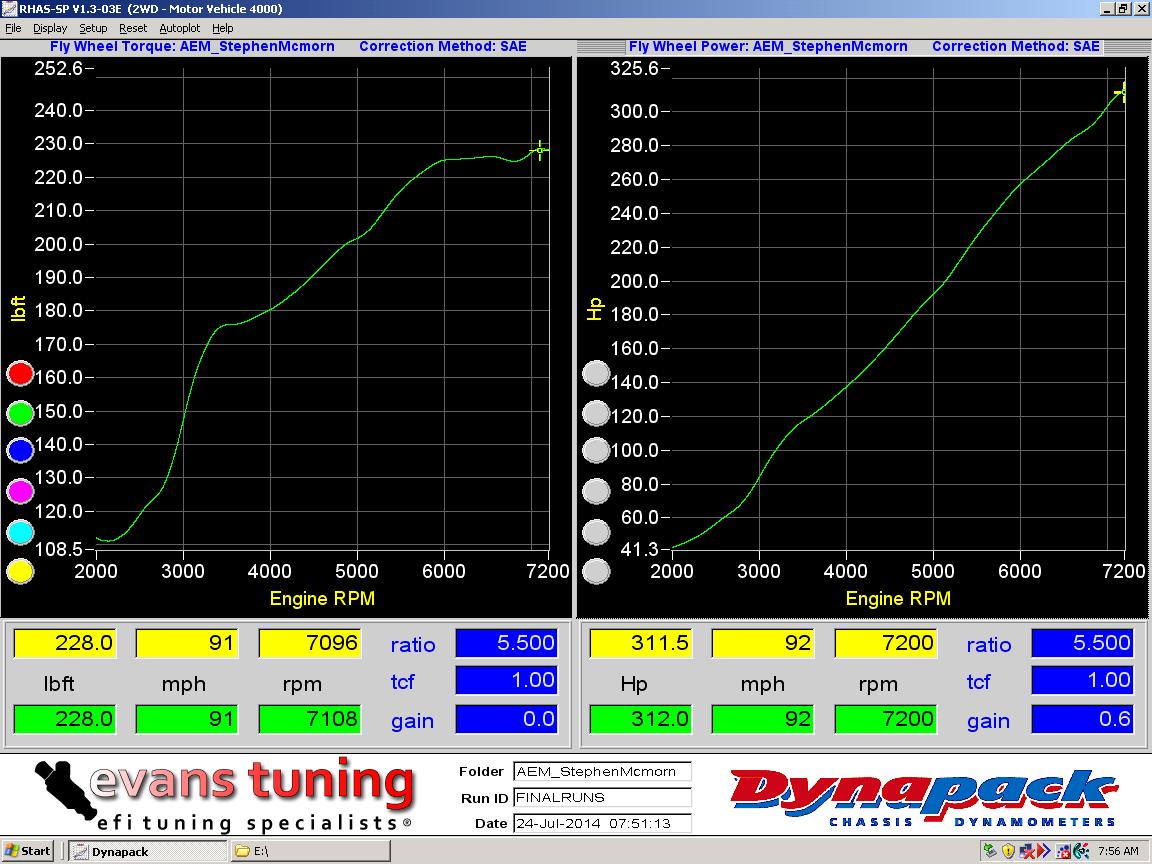 Tuned by Evans Tuning to 302 rear wheel hp / 230 tq at 12 psi on 93 octane