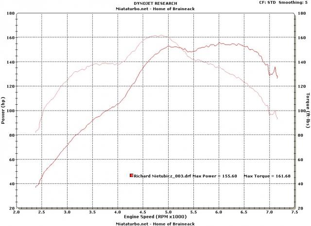 I thought these numbers posted on a thread on miata.net were somewhat interesting. I think it might be the fact I’m running a 99 head with stock cams as part of the reason mine falls on its face on the top end but I’ll take the wallop of mid range torgue and power any day. The fact that the power drops before redline is better than a shift light for keeping you in the safe operating range while on the track. Lag? whats that?