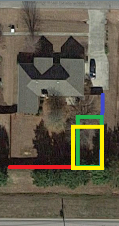 So I did some homework. According to Google Maps, the blue line above is 70 ft, and the red line is 90. The Green box is approximately 25x50 and the yellow box is approx 30x40. Both are backed up against the corner of the fence (i.e. the shop would replace that portion of fence) which is as far back as they can go without a waiver from the county.