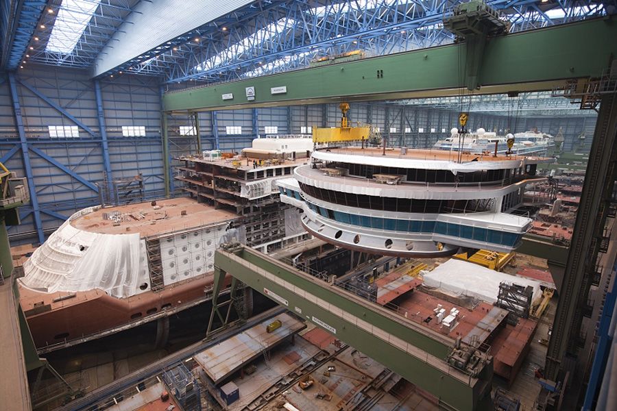 That's a ship that I worked on a few years ago during its construction in Germany. Here you see the big crane, in dockhalle 2, picking up the entire bridge and officers' quarters and preparing to slide them over into place on the ship.