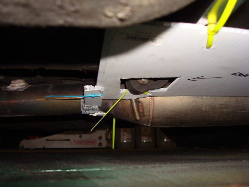 It starts a few inches ahead of where the floor ends, in line with the plastic bolts the tie down the plastic fuel filter cover. This pic has another piece intentionally sitting on the mid-pipe to see if it'd catch fire or merely just melt as I anticipated.