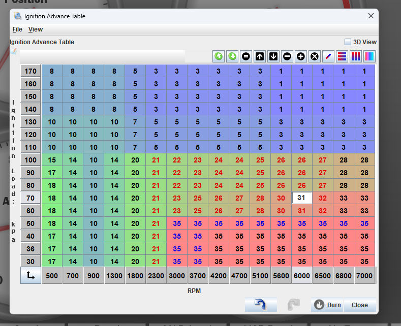 I wouldn't be surprised if you're knocking a good bit. Running 30 degrees everywhere is probably more timing than the engine wants. Assuming you're base timing is correct, I'd horizontally interpolate the columns from 1800-7K. I set the cruising areas to 35, but you should get something like this.