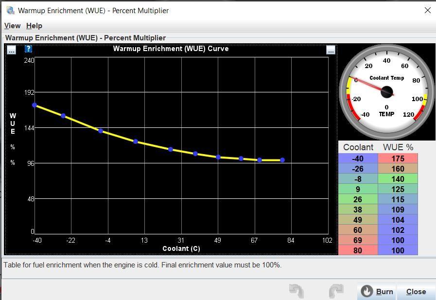 I changed the injector flow rate to 240 as a higher value than they output would result lack of fuel during more extreme conditions rather than too much fuel and potential leaks while at idle. While trying to get the car to run I had set the WUE to 120 in order to see if my lean condition would change but forgot to revert it.