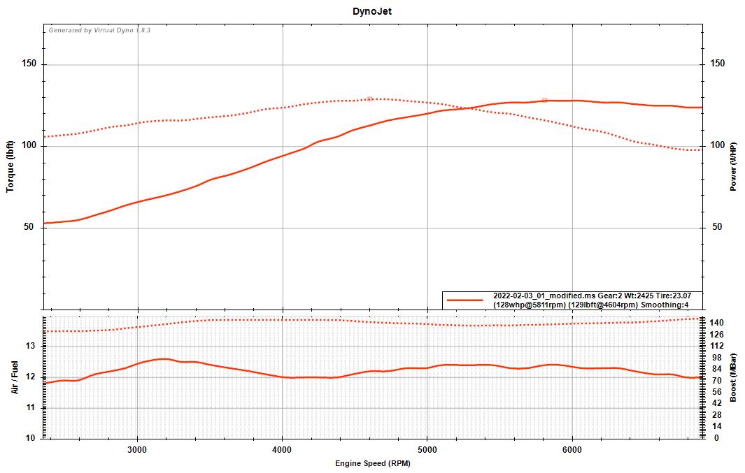 One thing I noticed on your virtual dyno plot is that at peak torque there is a bigger difference between your NA and supercharged torque lines than at redline. If you were making the same +23lbft over NA you do at peak torque at redline you would be at around 144whp. A clue that maybe your intake is restrictive, as this would affect power more and more as rpms increase.