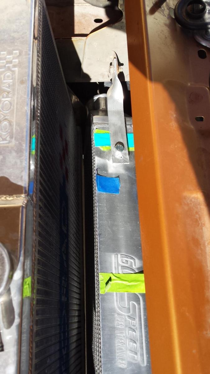 The multiple colors of tape were there to hold cardboard over the core for protection during years worth of storage. Radiator is pushed back so I could get pics. Angle on IC matches angle on radiator once its in place.