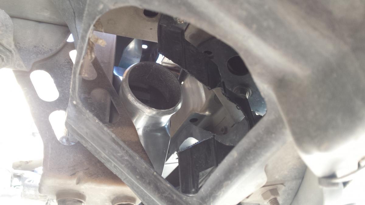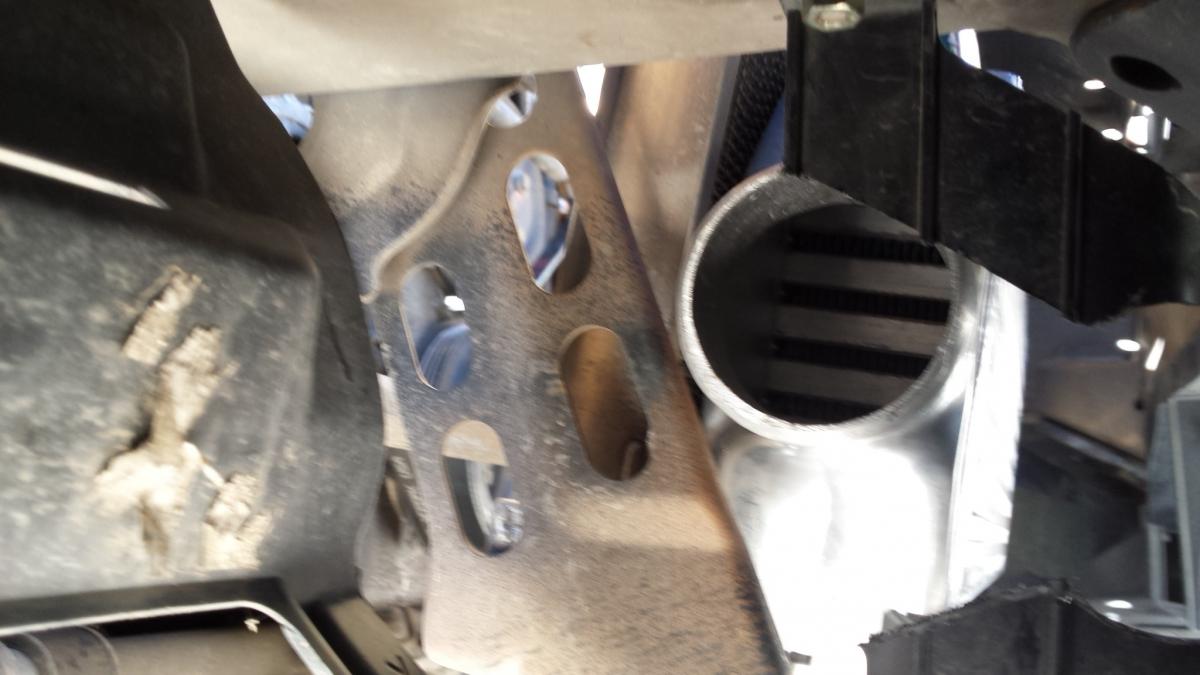 On a slightly reverse angle, you can see there is 1.5" gap between the bottom of the IC and the factory duct thing. I might look around and see if I can get a piece of 1.5" x 1.5" angle in there for additional rigidity and to block airflow.