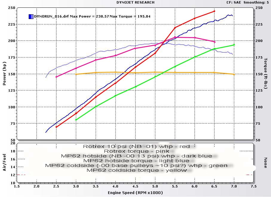 Heres a comparison i made with various charts i found on the net between a custom rotrex setup, mp62 hotside intercooled and the mp62 coldside.