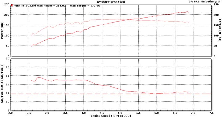 214 RWHP and just over 170 Torque. I'll post a copy of the dyno plot when I can get it scanned.