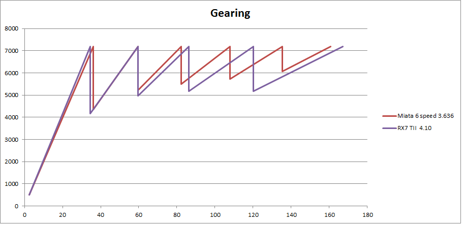 Pretty crummy jump between 4th and 5th. still looks bad to me with a 4.10 or 3.909. Best 5 speed gearing speed seems to be the Quafe wide but even that I think can be optimized for the track or for autocross but not both with the same rear end ratio. I just get enough speed out of second with the 6 speed 3.636 combo for autocross by turning up the rev limit to 8600 rpm Im not quite sure how much taller I can go before loosing power and throttle response for slower corners cost significantly. My guess is not much like 5mph more max. I have been over geared with the 5 speed for autocross before and it was an eye opening experiance with lower gears and a higher rev limit. Top speed is not important enough to sacrafice power and throttle response on the rest of the course but shifting to 3rd sucks.