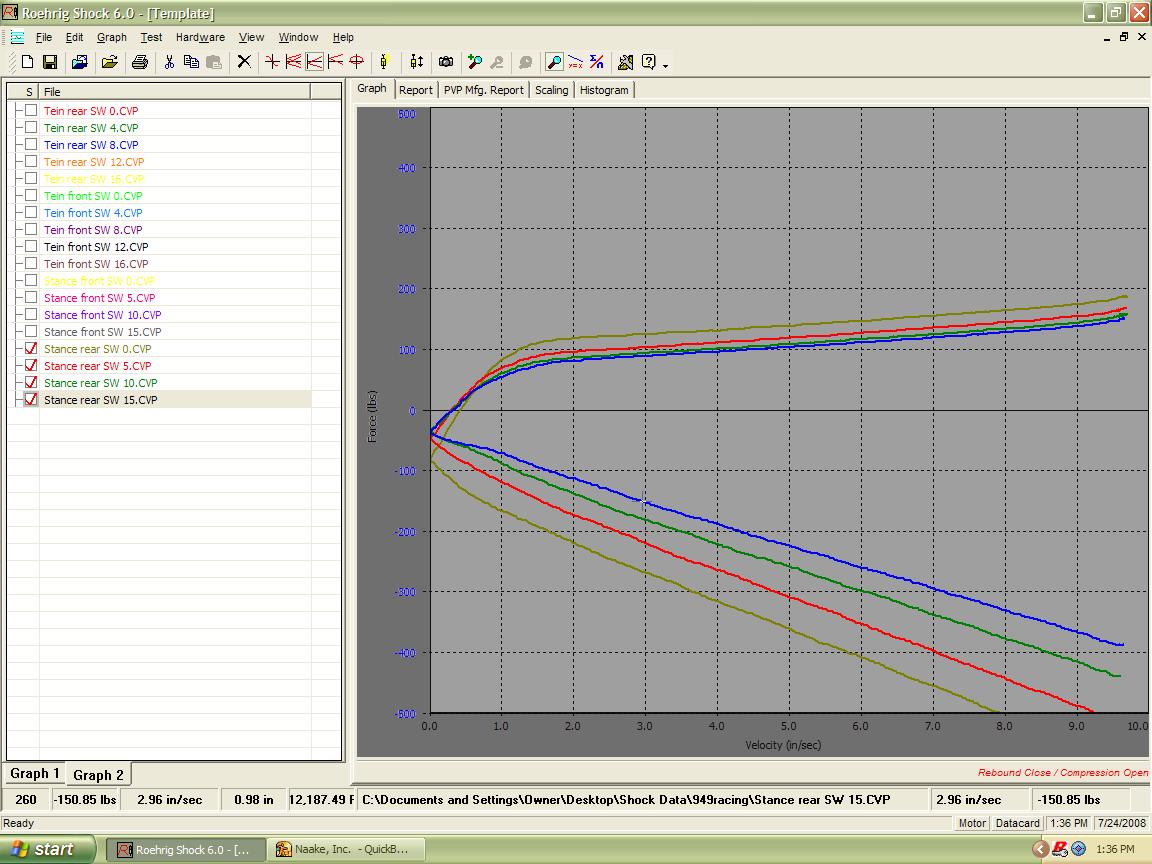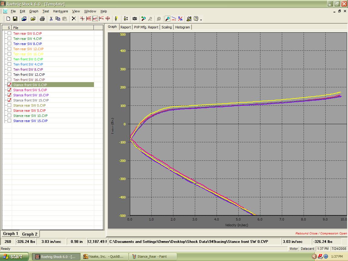 Fireindc, do you see how the rebound side (bottom) of the graph traces don't start at 0? This is because the bleed and shim stack is not resetting while on the shock dyno at TDC (think crank/piston). What I believe this means is that if you were to hit a series of bumps/ripples the car would ride like **** and jack down on the bump stops. Normally 0-3 seconds is small everyday bumps, and 3-10 is high speed fast movements. 0-3 is the most important graph for ride quality because thats were 95% of your driving on the street is done there. You normally want 65% of your critical damping to finish before 3s and then digress to about a 30 degree slope from there. Whats surprising is the clickers on the rear look pretty decent and linear, if you had that thing revalved with a different piston and stack it might be decent, the front doesn't do ****. OTS, it rides like holy ****.