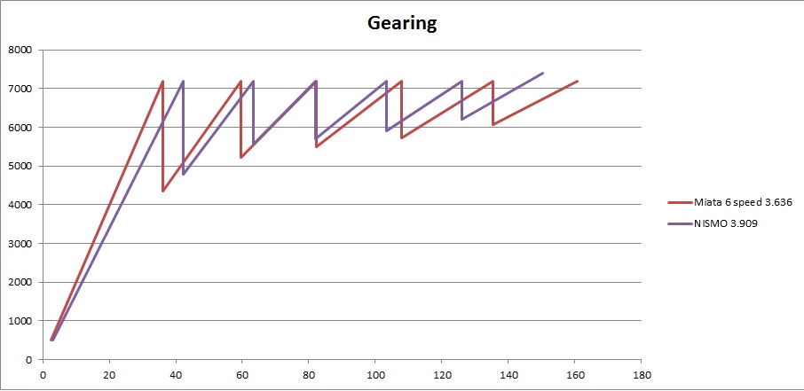 I sort of think these ratios would be freeking awesome for performance competition driving track or autocross. Very Useful first and second gear for autocross with 4 gears tightly spaced in the usable range for track driving 3rd through 6th pretty much perfectly placed for use on track. I will have a standard 6 speed S15 box in a few weeks to make sure if the parts can have interracial offspring as I think they can to produce a Miata box with Nissan internals.