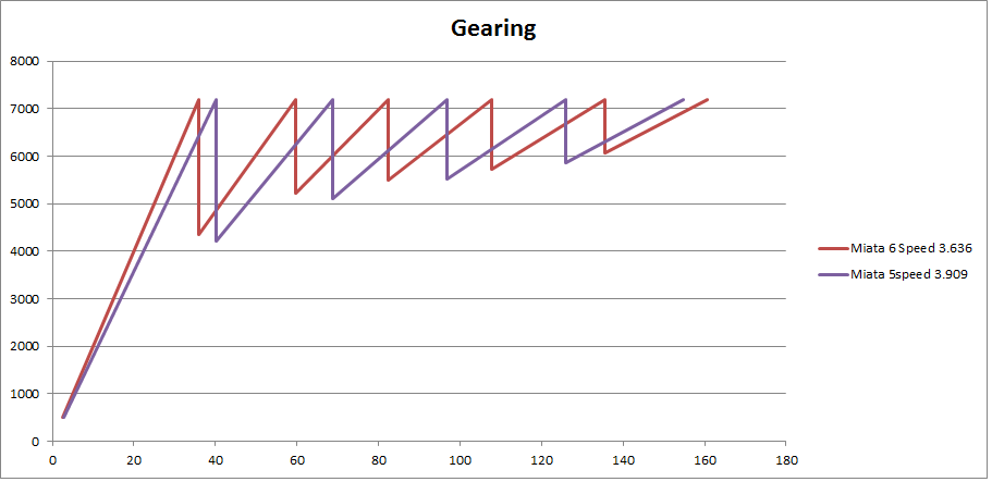 6 speed with 3.636 and 5 speed with 3.909: Both of these work for my purposes in terms of gearing. 5speed has better second gear for autocross. 6 speed might work better on the track with 3.909 but produces an un-usable second gear for autocross. 4th gear is a weak link in the 6 speed Miata box.