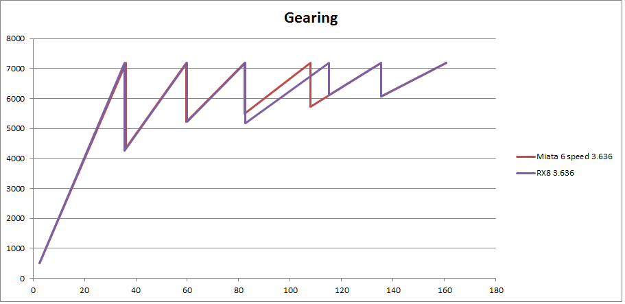 RX8 3.636 : interesting they changed only 4th gear from the Miata Box and the change makes no sense from a gearing stand point. Id be willing to bet this change was made entirely to address weak fatigue strength in 4th gear!