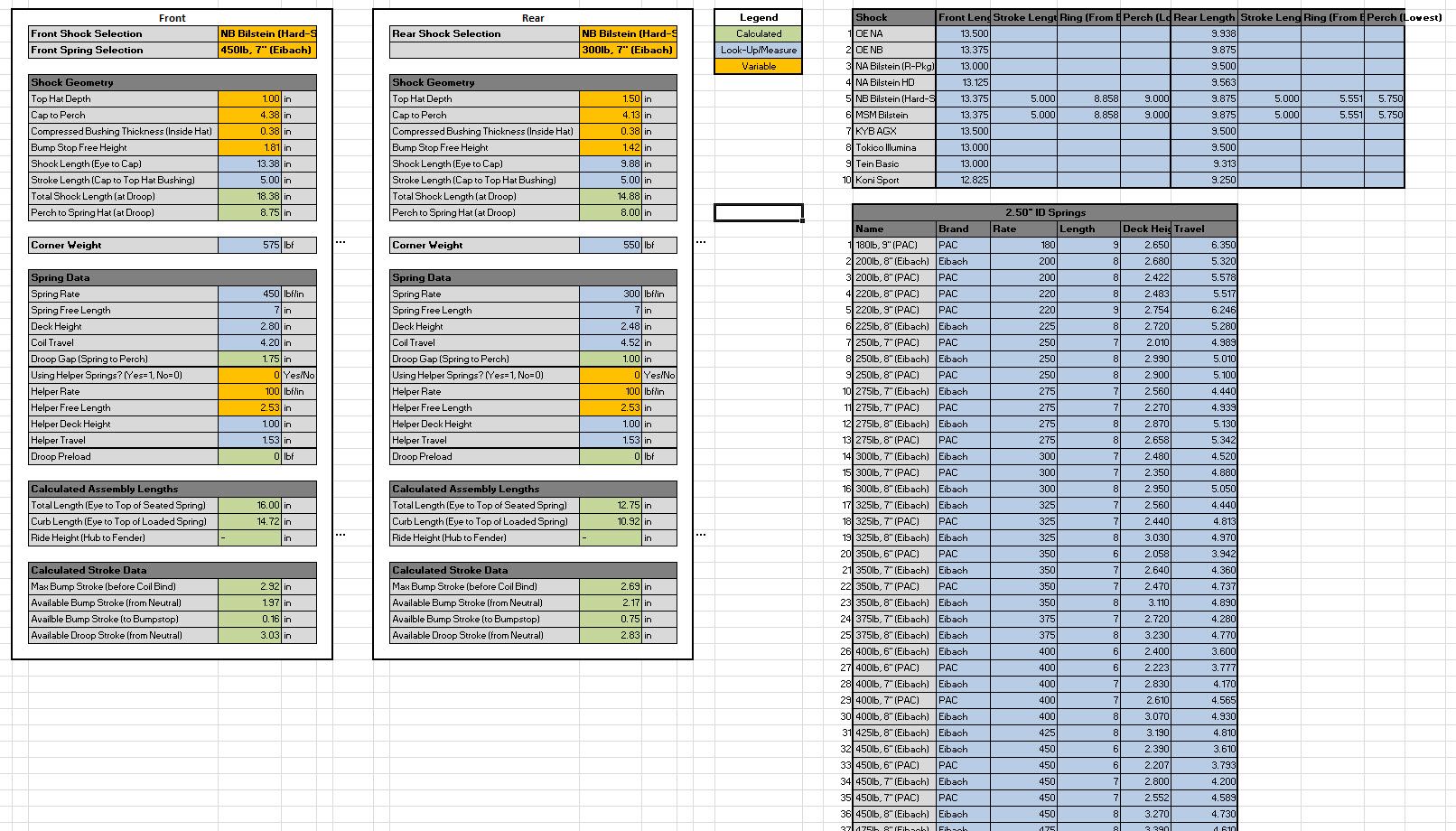 2. I have developed a pretty broad table database of spring parameters from Eibach (off summitracing.com) and PAC springs (racingsprings.com) to get started.