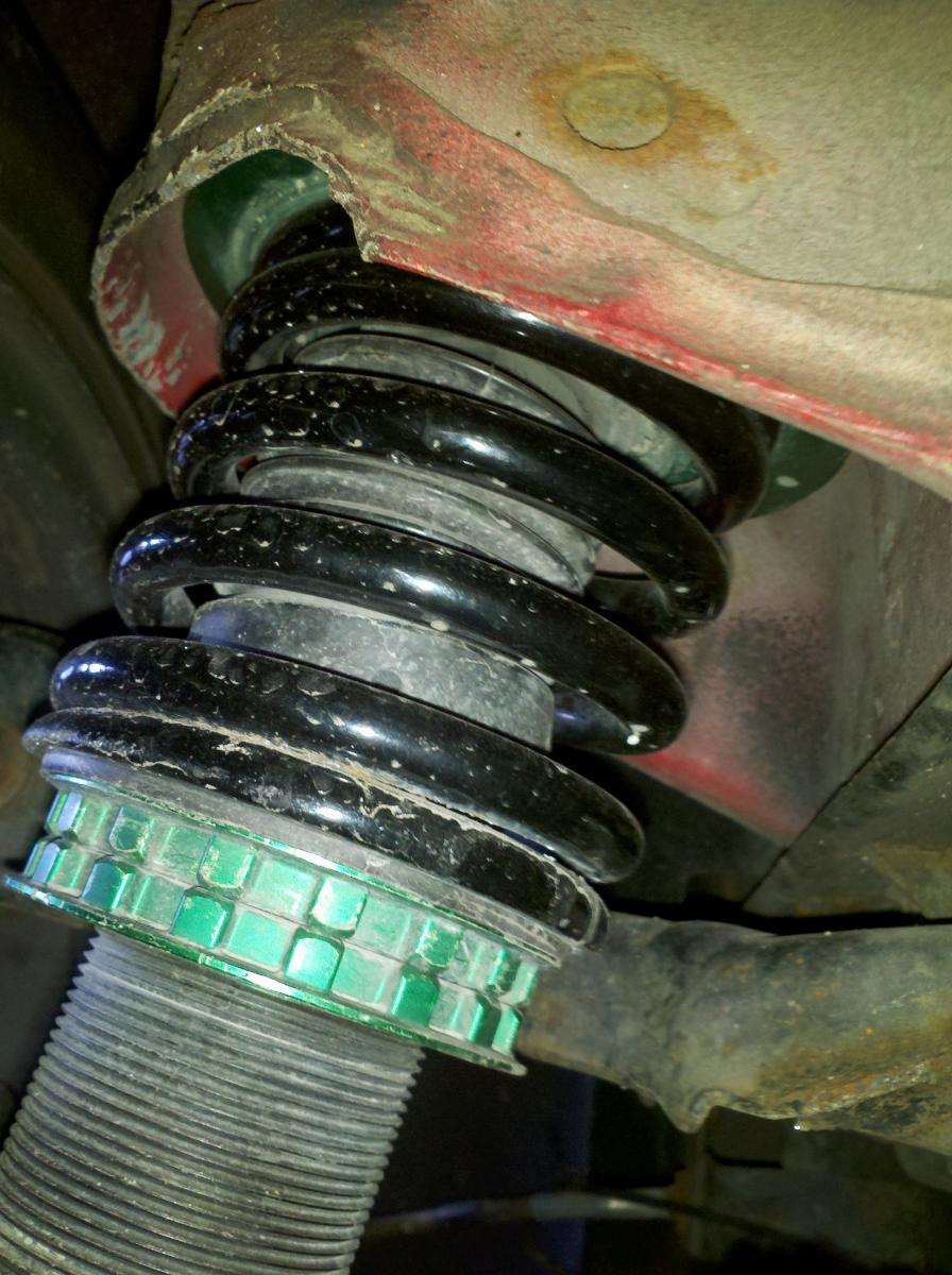 My springs are only 3.75" long at rest, per Tein's specs they have a max stroke of 3.7", so I only have 1.45" of travel before bind...I'm pretty sure my bump is getting compressed, but the spring is binding just before the bump will stop the shock travel.