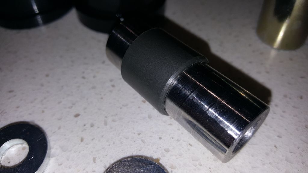 It's all pretty solid when it's together, so the plastic bearing surface kinda squashes into the bushing. It's tight enough that it won't move against the poly surface once installed. It then slides over the 4140 sleeve with enough friction to turn easily with a thumb and finger inside the sleeve. I only used the washers on the end where there are the adjustment bolts for alignment. The washers probably aren't really needed but it helps stop the dirt getting in.
