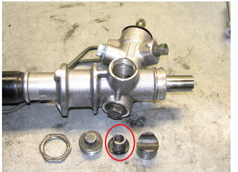 Everything is pretty straight forward. I was able to weld the pinion with .035 wire on my Miller Weld Pack 100 MIG. Settings at C and wire speed ~1.5 and it turned out ok, after some grinding. I do have a question though. There is a tension spring located in front of the pinion housing. I assume this spring is there to provide friction to the power steering so it's not just a limp noodle in your hand and gives some sort of resistance (force) to your inputs. Circled in red in the image.
