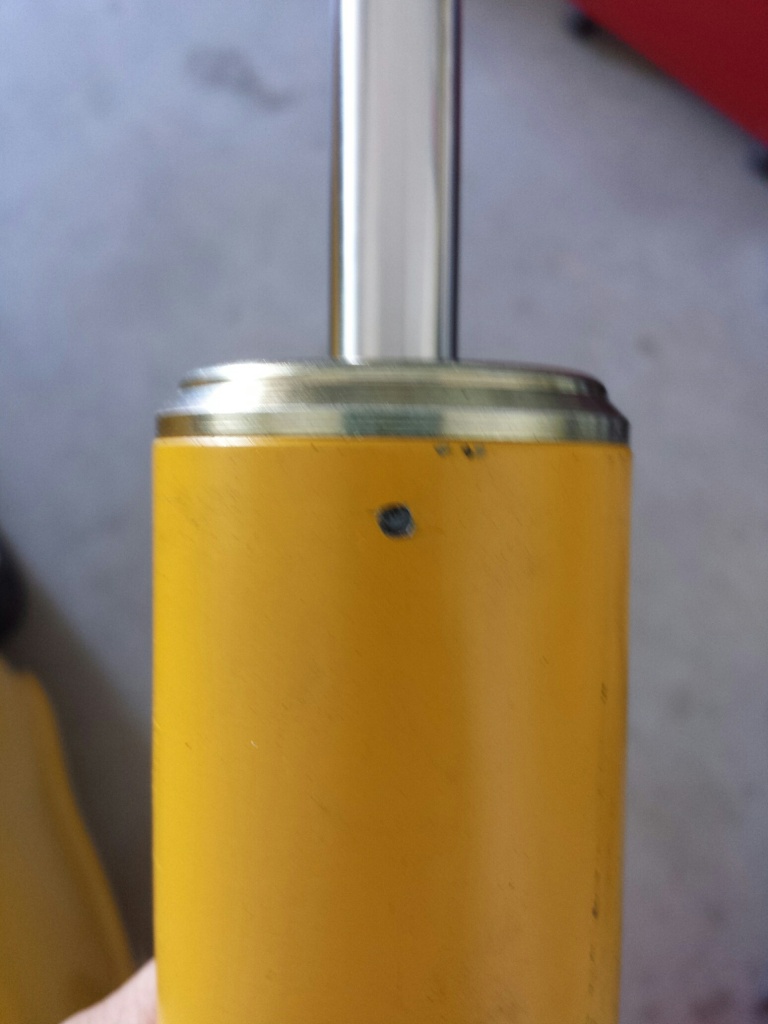 Noticed some drips on the floor sometime around May. I thought the leakage was coming from the shaft seal as there was a small puddle on top of the wiper. I cleaned it up and checked my....errr...the shaft for any obvious nicks/scratches and couldn't find anything. (that's what she...) After cleaning, I function tested the shock and couldn't get ANY leakage.