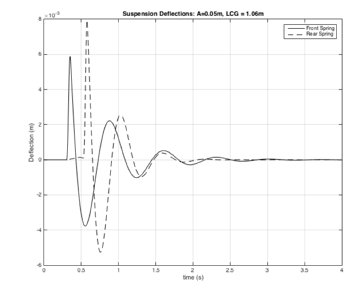 Here is a plot of suspension deflection of the front and rear driving over a 2" triangular bump at ~22mph. This is using spring rates for a 1994 with Bilstein dampers.