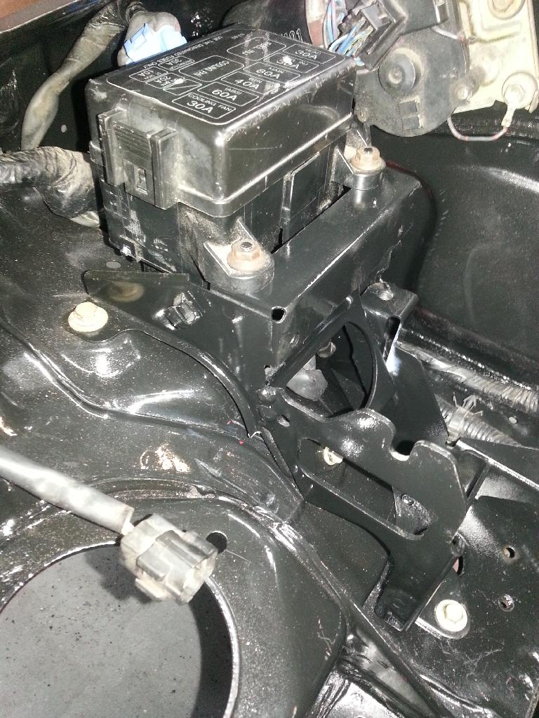 Since my installation was replacing an existing ABS system with a newer system. I just copied the original fuse box/ABS mount. Fabricated some 3/16" steel into two 90* ears and welded them to the new bracket. Drilled and taped for 6mm studs. Basically just copied the old bracket layout. Hyde's solution is probably easier and quicker. I still have to unplug the wiper connector to open the fuse box lid.