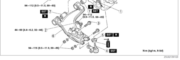 I was looking at the FSM to torque up my lower shock mount and ball joint through bolt and I noticed that the FSM shows what appears to be a split/spring washer. I thought that was odd as I don't have any washers there currently, but perhaps I forgot to put them back. I go online to check the part number to order, the the parts diagram doesn't show any washer there! Even more odd...