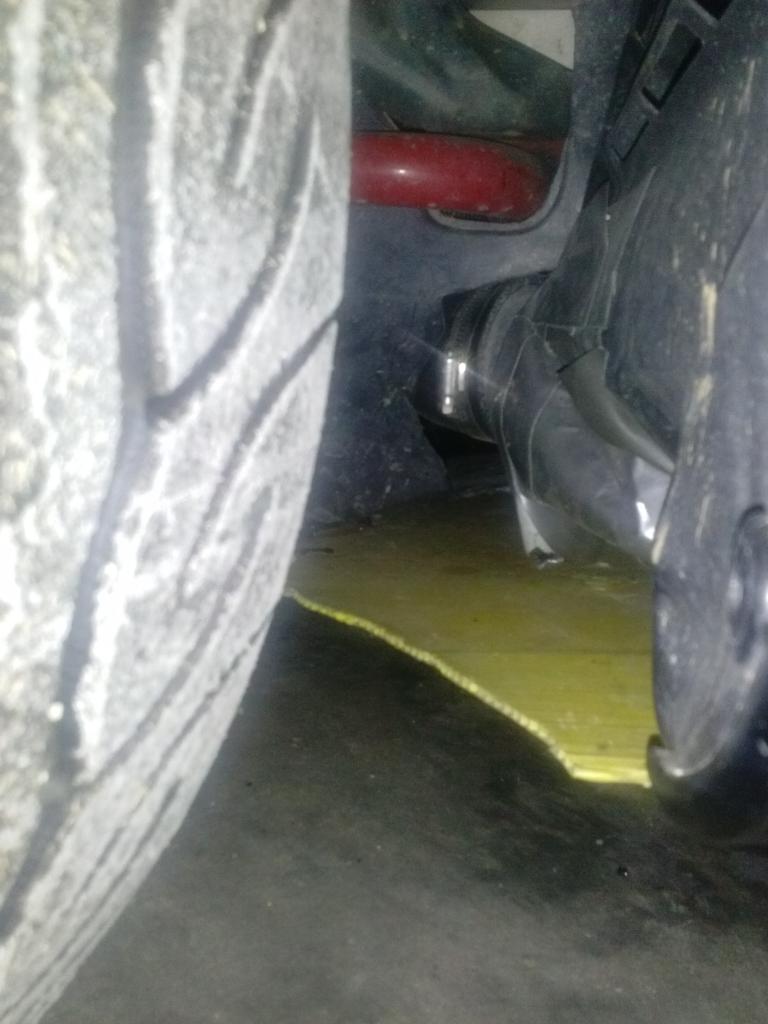 Passenger side wheel, comes out of the belly pan and into the wheel cover area. I put two pieces of duct tape together and attached them to the wheel well liner to prevent rocks and stuff from getting kicked into the intake.