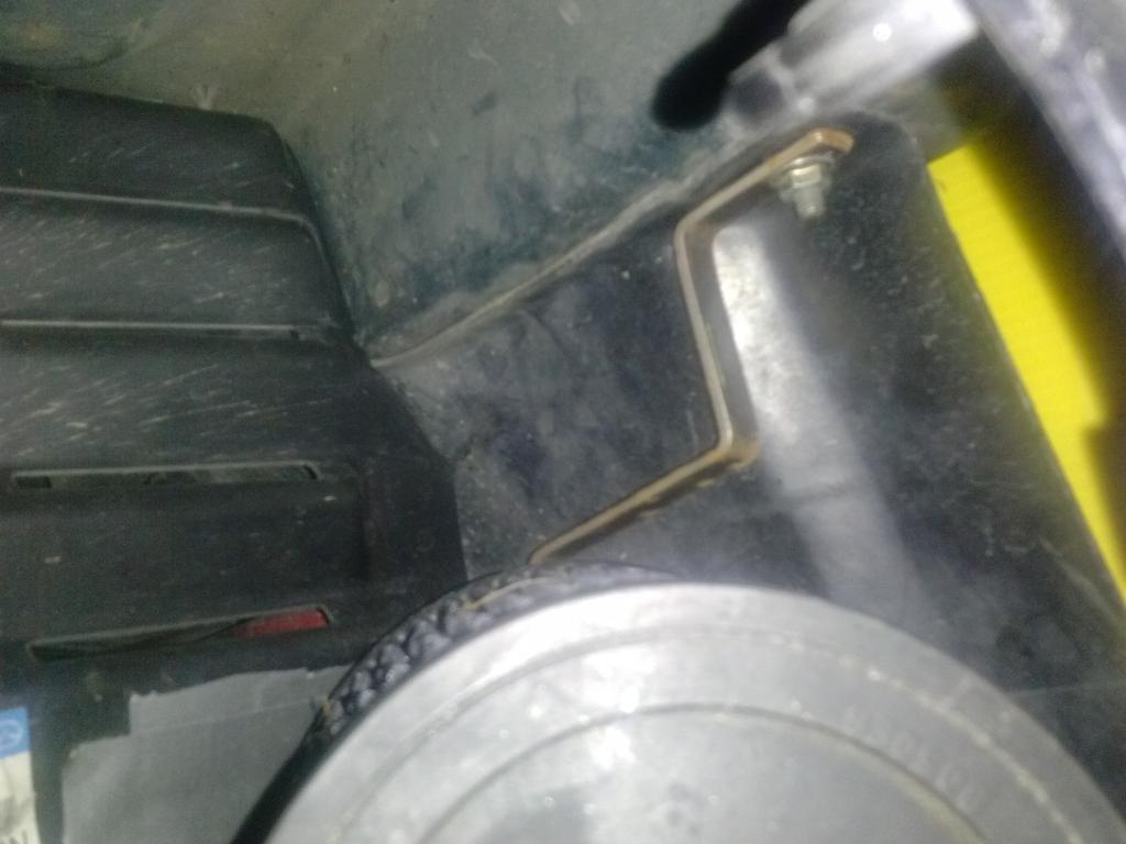 Here is a view from inside the fog light hole. Note the metal brace I am using to support the intake. It attaches to the same bolt that the belly pan goes to.