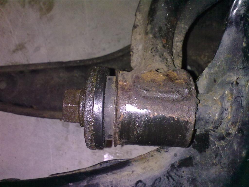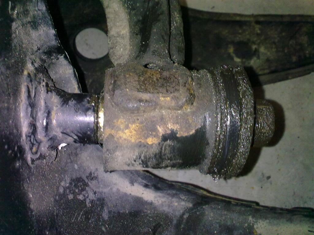 Notice my slightly bend upper left A-arm, but Im leaving it. It doesnt go anywhere as the bushing inner sleeve is keeping things in place.