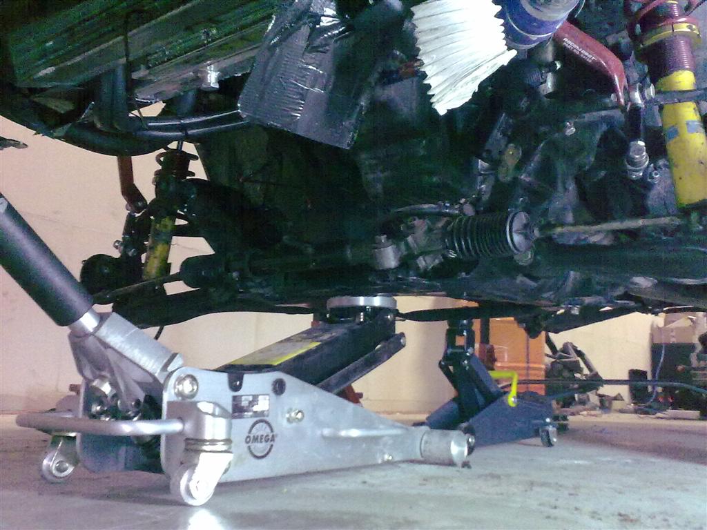 * The subframe is near perfectly balanced under the main cross member so you can balance it on a rolling jack