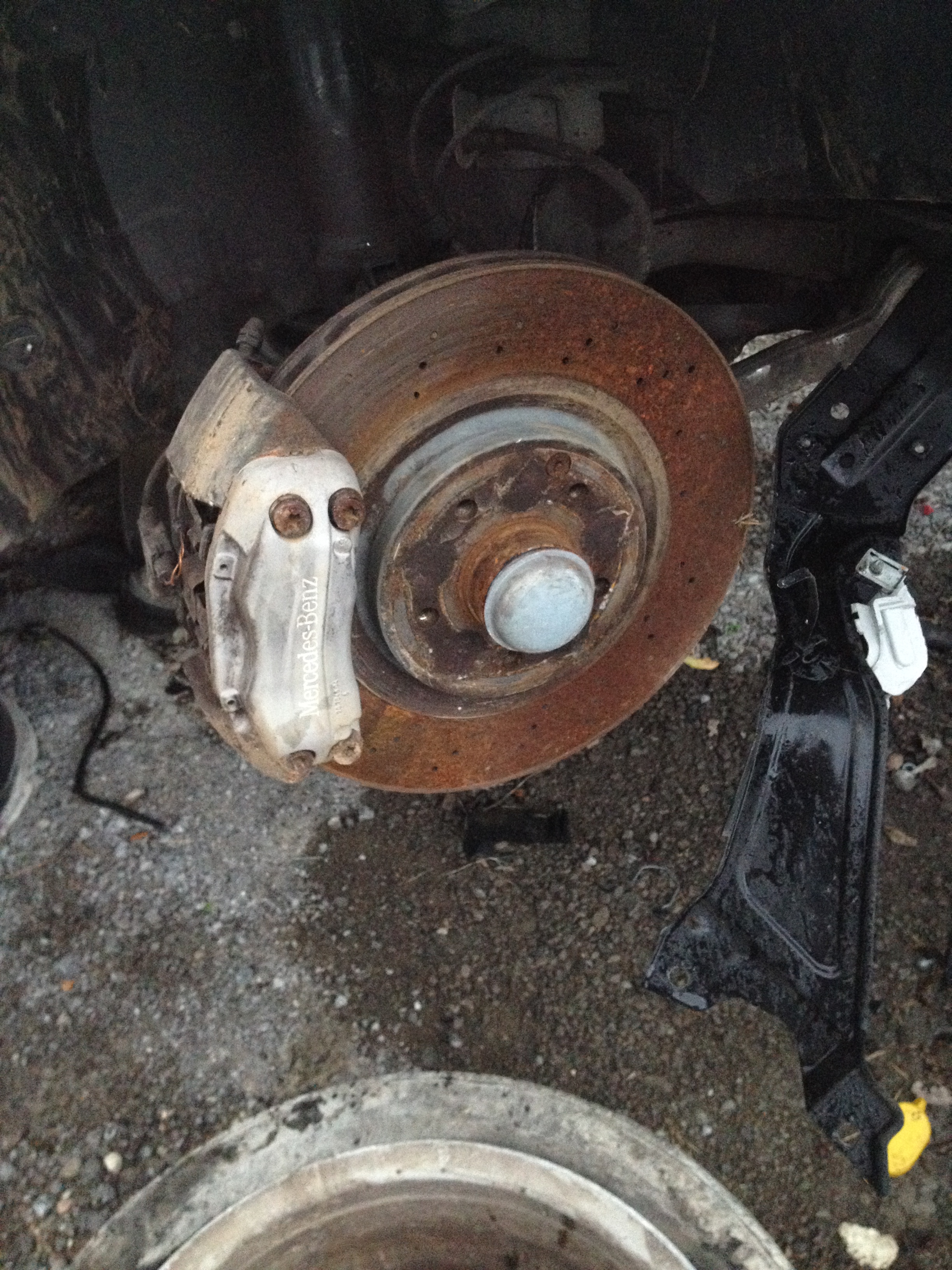 You want a junk yard merc caliper. Why? Better brakes? If you want to increase the performance of your brakes we’ll need to know the piston area, pad size, pad swept depth, rotor swept depth, pad thickness, compound, master cylinder size, balance of the car, spring rates, average operating temps. Then I’ll need to see what you have in the rear to take up the difference in compound coefficient of friction, rotor size, and hydraulic advantage.