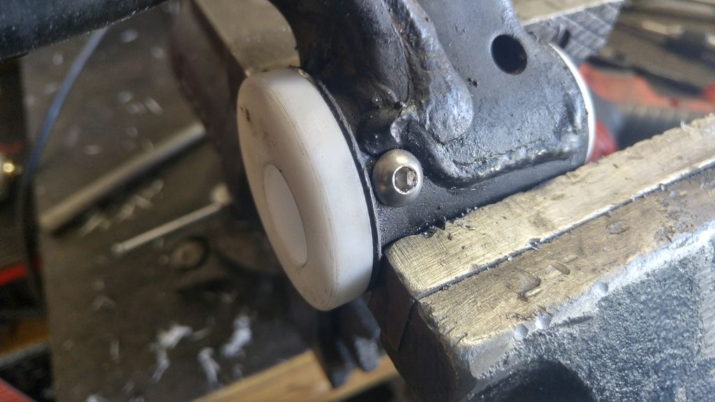The bolts are all fully torqued, and there is absolutely zero play. The tapping noise is the RLCA bumping into the bottom of my damper. I "reamed" the delrin with a 7/8" drill bit until it had about the same resistance to rotation as a spherical in good condition. This is all before greasing the delrin bushings, but as you can see there is minimal friction. In the awkward camera position, the weight of the upright is quite a lot for me to lift (I am not a big guy), but I can still move it very easily with absolutely zero stick-slip.