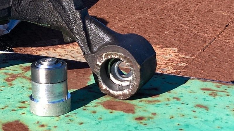 Next thing Sean and I noticed is that the bushing thrust faces were starting to chew themselves up, the sleeves had scoring on them, the plating had been worn off and the Energy Suspension grease had turned into almost an adhesive now that dirt and dust had been mixed in. A shop press was required to get most of them out.