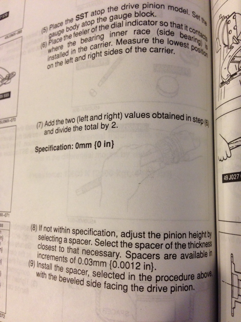 . Also Mazda doesn't state what the "nominal" shim thickness is (the one you are theoretically starting with when you use the SST...). Now assuming the markings correspond to absolute values of 0.03mm and 0.09mm I can see arguments for at least four different thicknesses for the "new" shim:- The nominal starting shim is 3.14mm, and the pinion markings 3 and K9 represent +.03mm and +.09mm. So the new shim should be .06mm greater (+0.09 minus +0.03 = +0.06) than the old one, which would equal 3.23mm