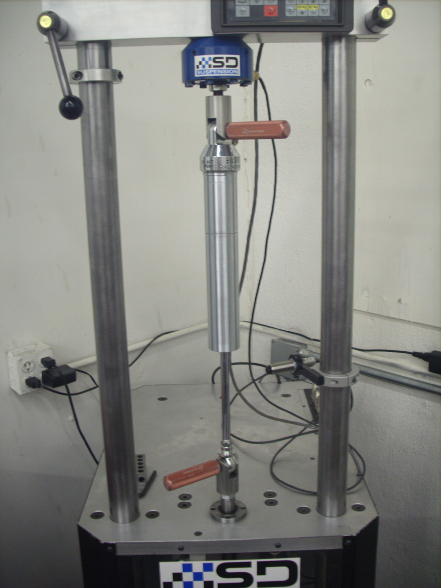 Here is the shock on the dyno being set up for the initial runs. At this point, I am setting the preload and about to adjust the IR temp sensor.