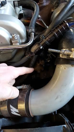 It has two ports, one which goes down to the engine right behind the top right pulley (i'm trying to point to it in the picture)